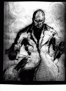 This first one of the character Father Michael was drawn by my close friend, Mike Chella. Dude looks badass. Unfortunately it comes out grainy here, but I loved the dark style that Mike brought to the project. The panels Mike drew are what inspired me to keep working on the story and escalating the madness!